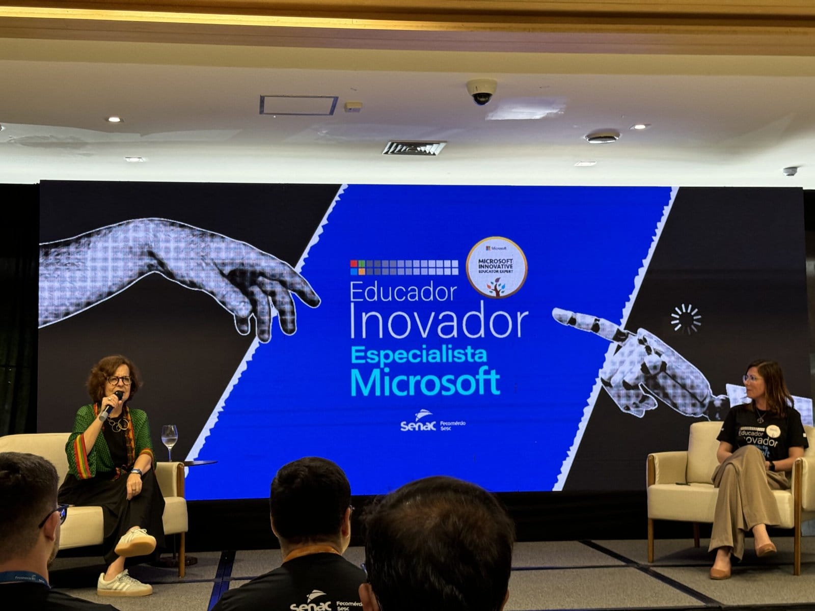 Um dos momentos mais marcantes foi a conversa enriquecedora com a Diretora de Educação para as Américas da Microsoft, Vera Lúcia Cabral Costa, que trouxe reflexões sobre o futuro da aprendizagem e a integração de tecnologias no ambiente educacional.